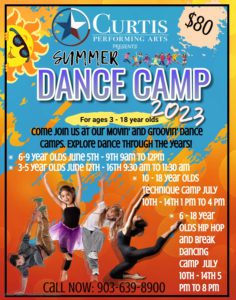 Curtis Performing Arts will be offering Summer Technique classes and camps. Space will be limited and dancers will be let in on a first come first serve basis. All campers will receive a camp t-shirt to wear the last day of camp.